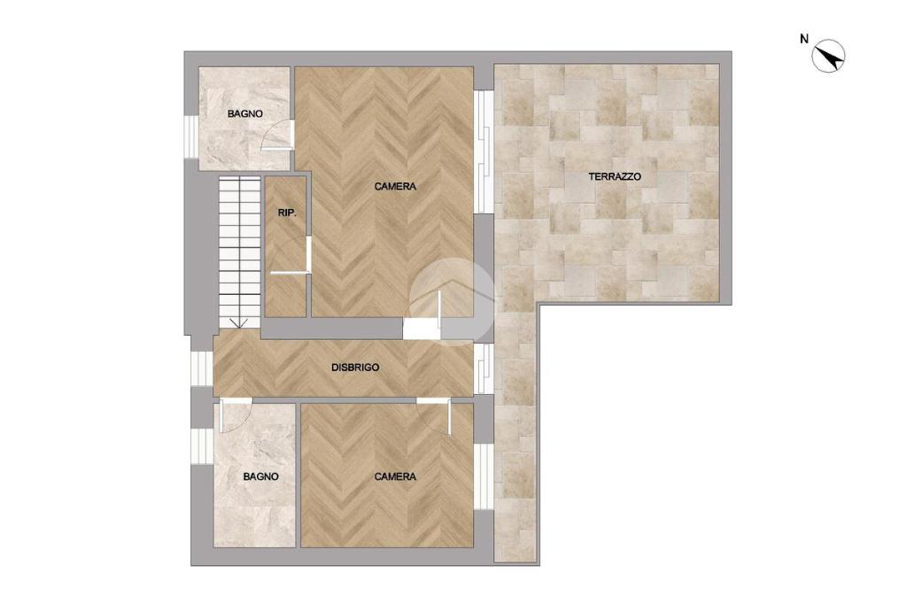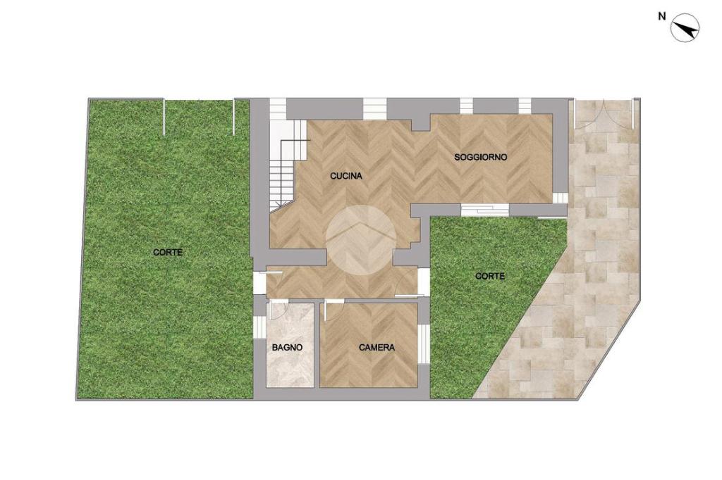 L’ingresso principale introduce alla zona giorno al piano terra, composta da un soggiorno accogliente e da una cucina. Su questo stesso livello troviamo una camera da letto matrimoniale e un bagno finestrato con box doccia, garantendo così una completa funzionalità anche al piano inferiore.