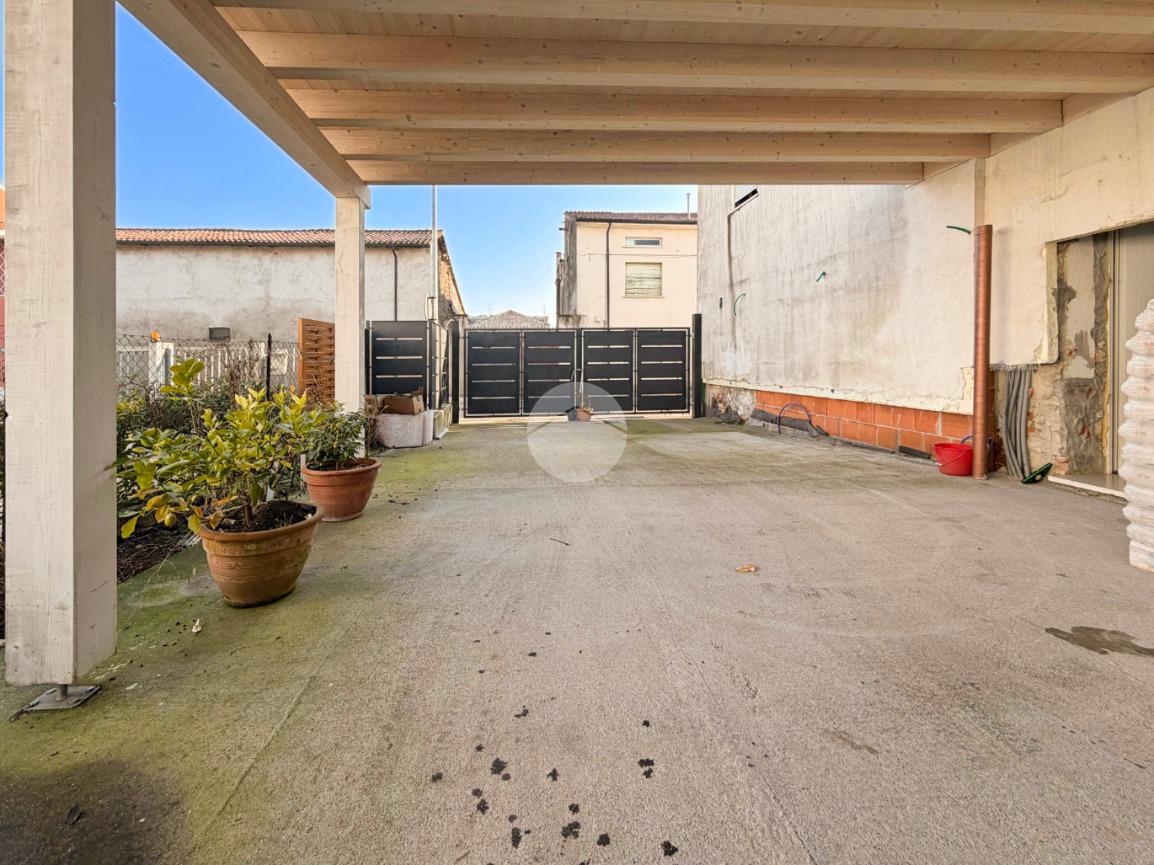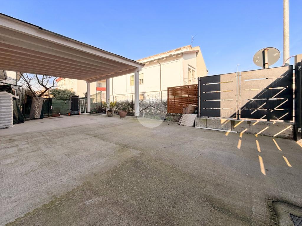 Gli spazi esterni comprendono una corte privata che circonda l'abitazione, con un comodo passaggio carrabile che conduce a una tettoia di proprietà utilizzabile come posto auto coperto.